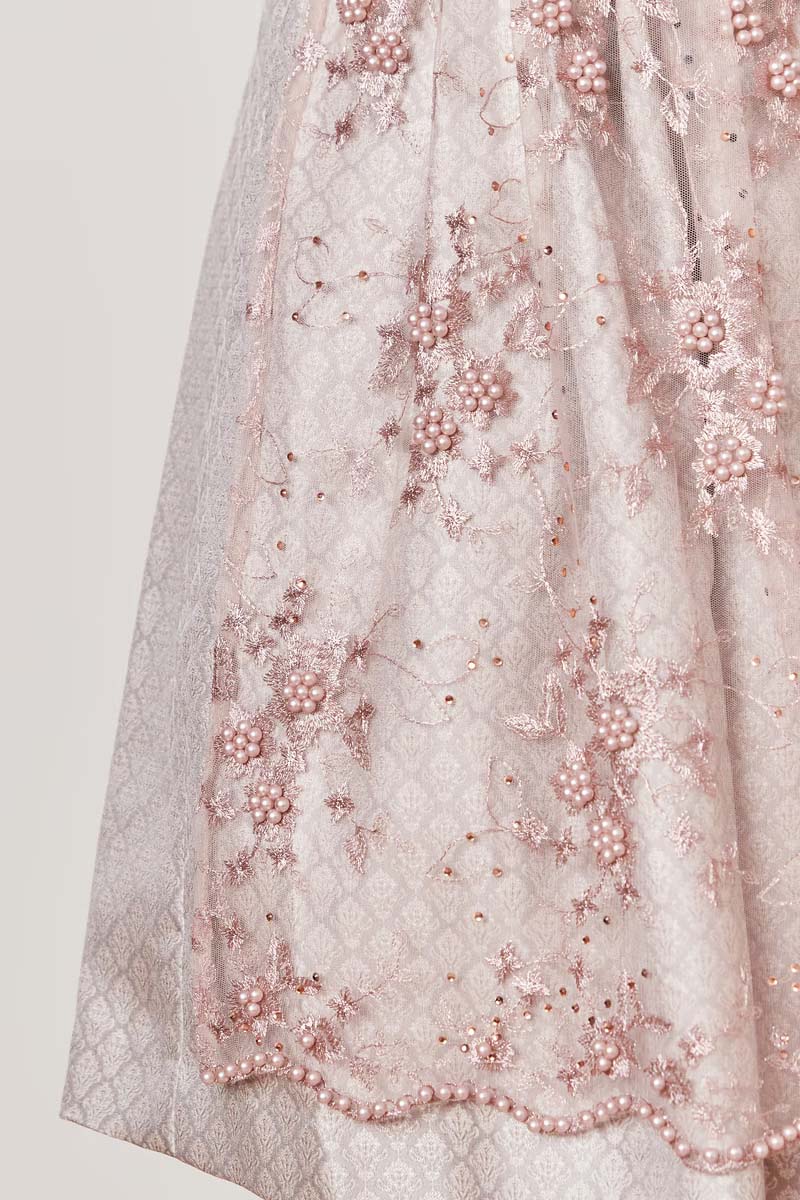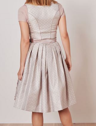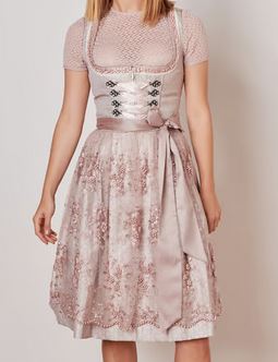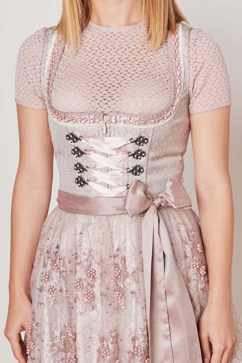 in Kürze: Mididirndl, Farbe: rosa, Rocklänge ca. 60cm, zwei Eingrifftaschen, rosafarbener Stoff mit Webmuster, gerader Ausschnitt mit Bordüren, Reißverschluss vorne unter Miederschnürung, transparente Schürze mit Stickereien und Perlen