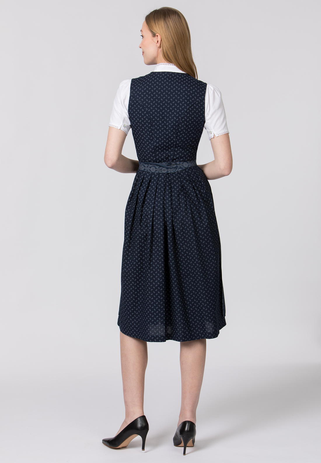 Edles Baumwolldirndl in dunkelblau aus der Kollektion von Stockerpoint. Das hochgeschlossene Mididirndl "Ellie" mit V-Ausschnitt und Metallknöpfen wird mit einem floralen All- Over Muster geschmückt. Dazu passt die dunkelblaue Schürze mit edlem Rankenmuster. Das Schürzenband wird mit einer hübschen Metallschließe geschlossen. Ein absoluter Hingucker für die kommende Trachtensaison.