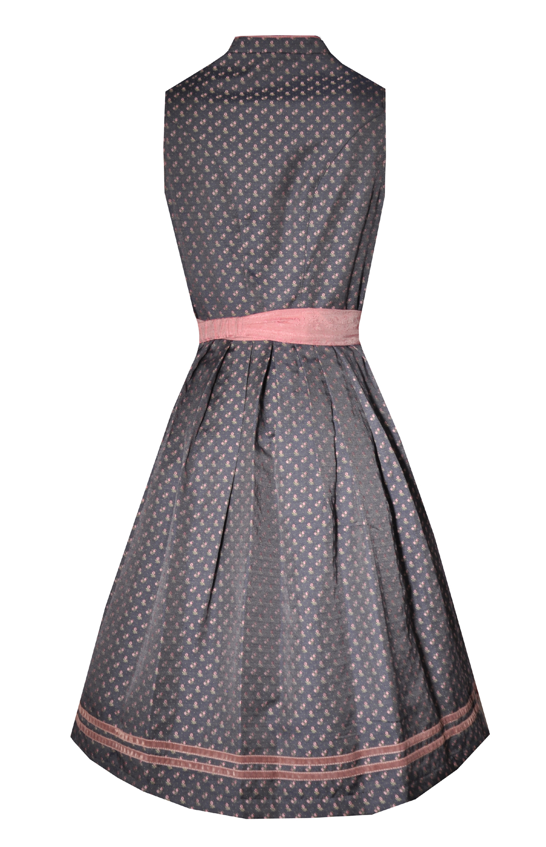 in Kürze: Mididirndl, Farbe: blau, rosenholz, rosa, hochgeschlossen, Stoff aus rosa Streublümchen, fein glänzender blauer Webstoff, V-Ausschnitt mit rosafarbener Kontrastpaspel, altsilberne Trachtenknöpfe mit Glitzersteinchen, schimmernde Webschürze mit dezentem Blumenmuster, antik verzierte Schürenschließe in altsilber, Rock mit Samtborten im Saumbereich