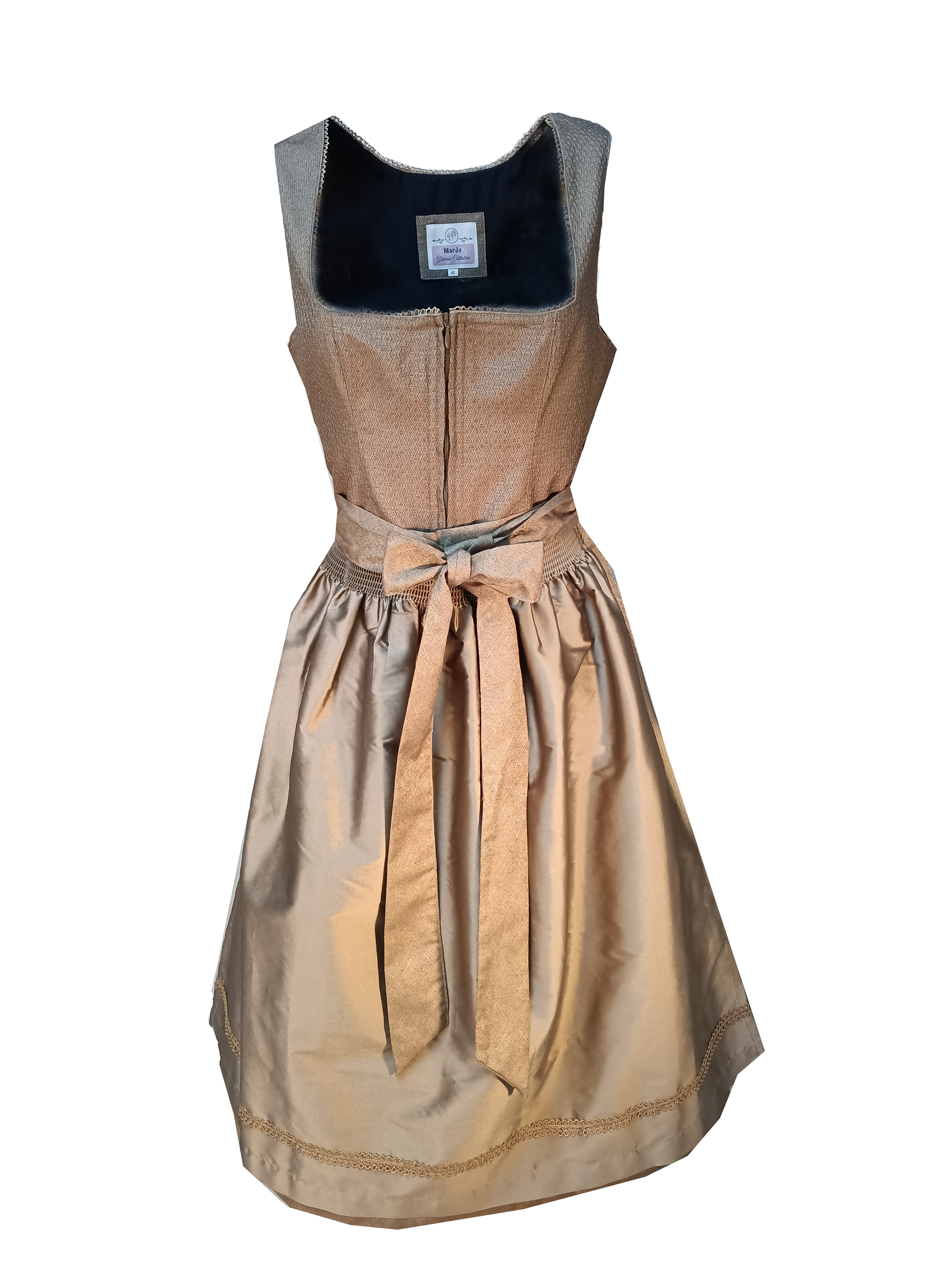 Bezauberndes Dirndl "Mauth" in der Farbe Haselnuss aus der aktuellen Kollektion von Marjo. Das taillierte und abgefütterte Mieder aus Jaquardstoff überzeugt mit einem Rautenmuster und einen Balconetteausschnitt mit feiner Borte. Der Reißverschluss erleichtert das An- und Ausziehen. Dazu passt der ebenfalls aus Jaquardstoff gefertigte Rock mit feinem Webmuster und zwei Eingriffstaschen. Abgerundet wird das Gesamtbild mit der Schürze, welche durch eine edle Bordüre geschmückt wird.