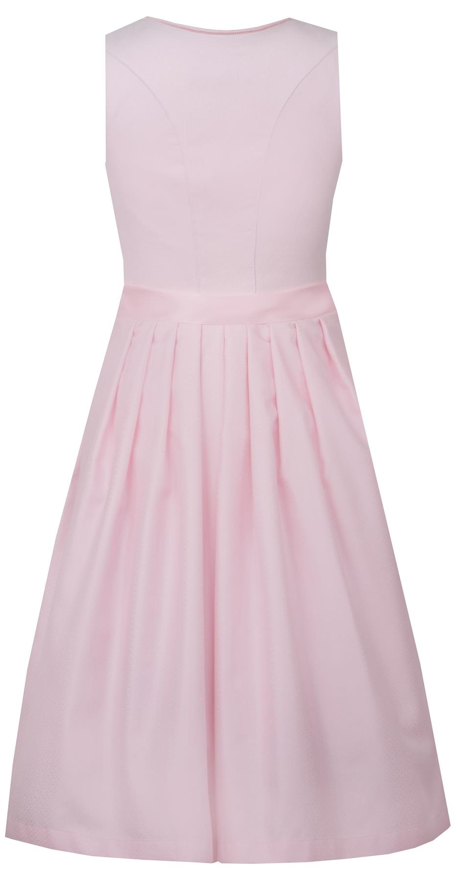 In Kürze: Dirndl midi, "Hofstetten", Farbe: puderrosa / helles pink, Cord-Mieder, Reißverschluss, Rock mit Muster, Schürze Seersucker, Glanzbindeband, zwei Eingrifftaschen