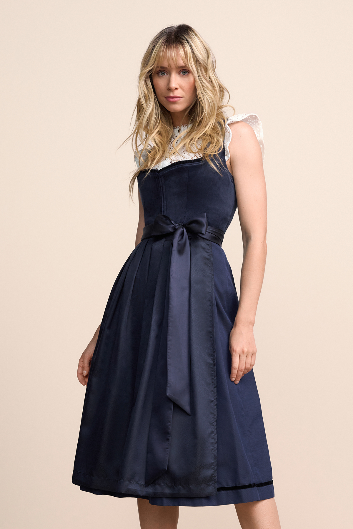 In Kürze: Dirndl midi "Elenora, Farbe: marine blau, Samt, Balkonettausschnitt, Hakenverschluss
