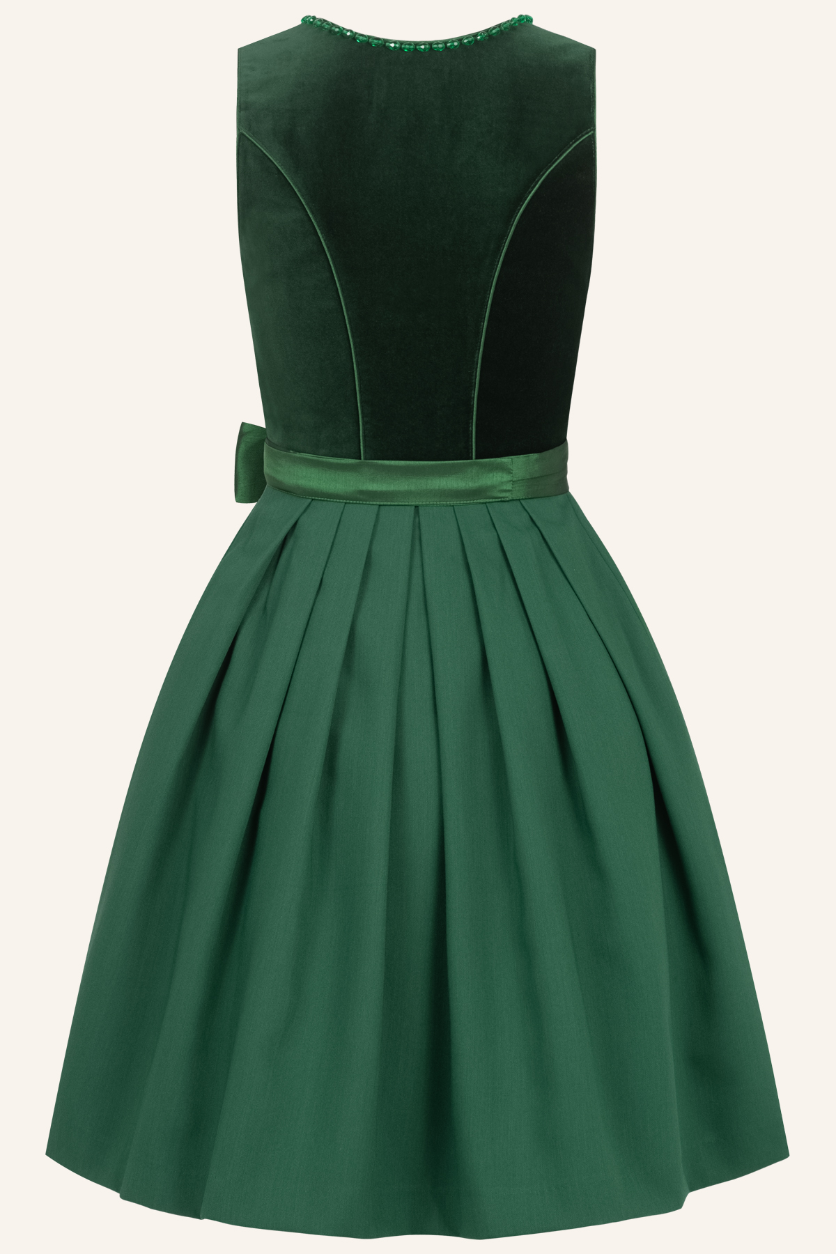 In Kürze: Dirndl midi, Nyala, Farbe: dunkelgrün, Balkonettausschnitt, Haken, unifarben, Eingriffstaschen, Samt, Glitzersteine