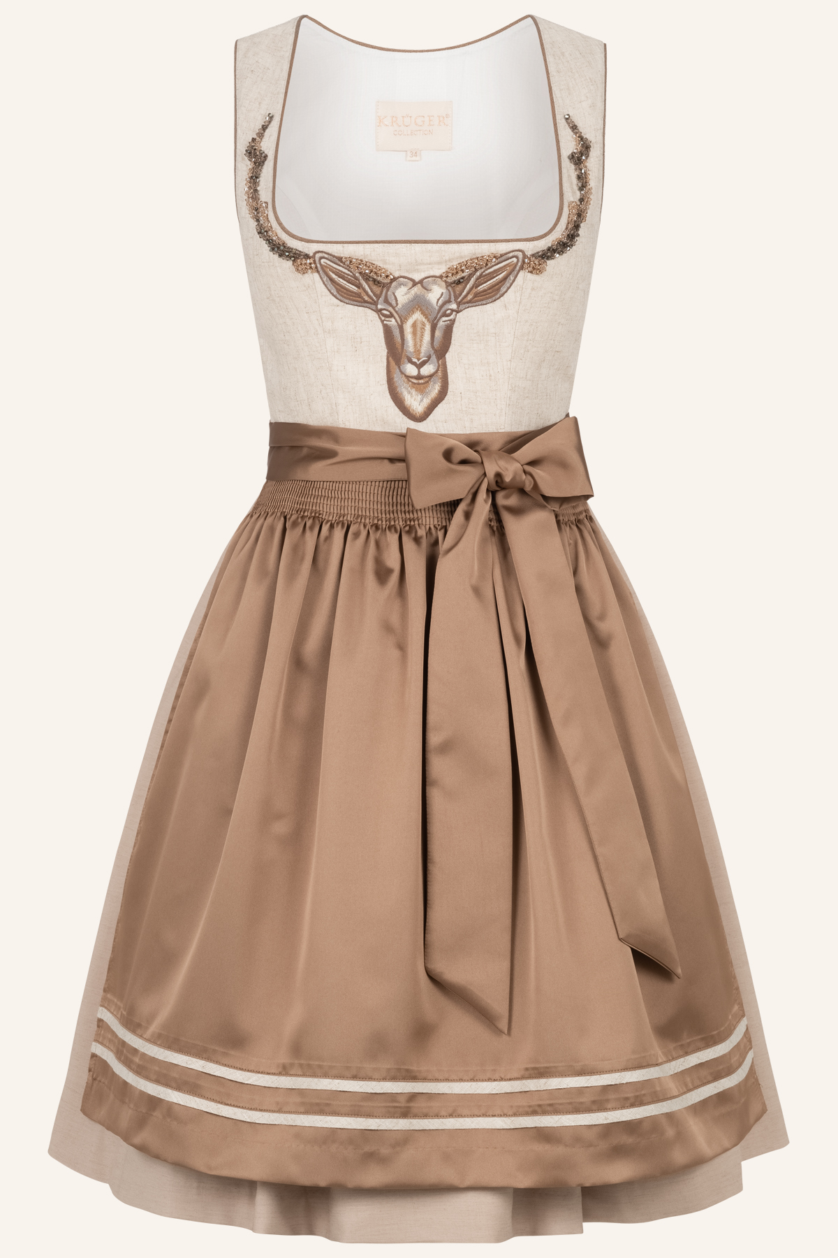 Rocklänge ca. 60 cmIn Kürze: Dirndl midi, Kudu, Farbe: beige, Balkonettausschnitt, Reißverschluss, Eingriffstaschen, Glitzersteine