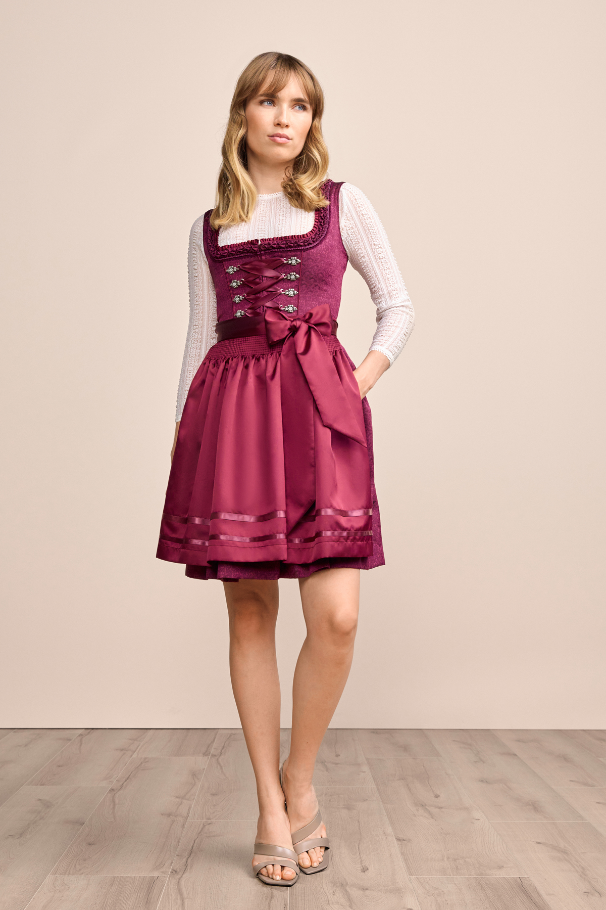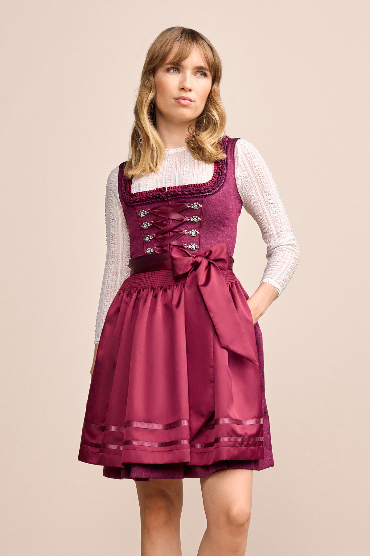 Das Dirndl Thialda überzeugt mit einem schlichten, taillierten Schnitt und einem geraden Ausschnitt – zeitlose Eleganz pur. Der knieumspielende Rock (ca. 50 cm) bietet zwei praktische Eingrifftaschen für Kleinigkeiten. Der vordere Reißverschluss erleichtert An- und Ausziehen und erhöht den Tragekomfort. Eine dezente, schlichte Schürze sowie der ärmellose Schnitt verbinden traditionelle Elemente mit einem frischen, modernen Look. Die Miederschnürung sorgt für eine perfekte Passform und betont die feminine Silhouette. Mit dem Dirndl Thialda vereinen sich moderner Stil und klassische Eleganz auf charmante Weise.