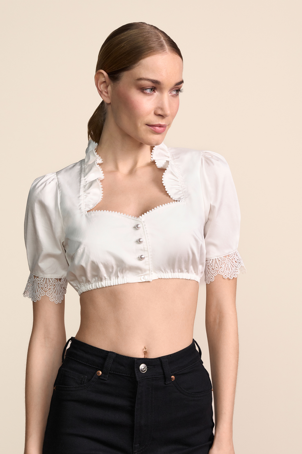 In Kürze: Dirndlbluse, Ariwen, Farbe: ecru, Herz-Ausschnitt, Knöpfe vorne, Perlenoptik, Spitze, Unterbrustgummi