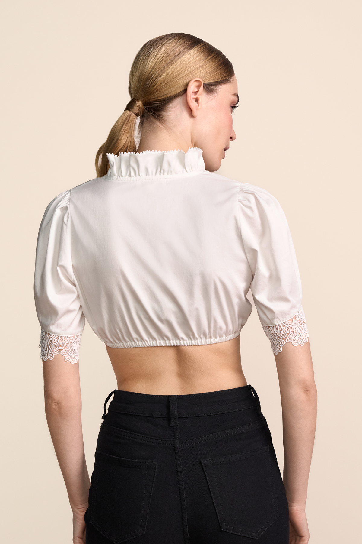 Knöpfe in edler Perlenoptik ergänzen das Design auf harmonische Weise und verleihen der Bluse einen besonders eleganten Charakter. Durch ihre klassische Gestaltung mit raffinierten Details lässt sich die Bluse vielseitig zu Dirndln kombinieren und eignet sich ideal für festliche Anlässe.