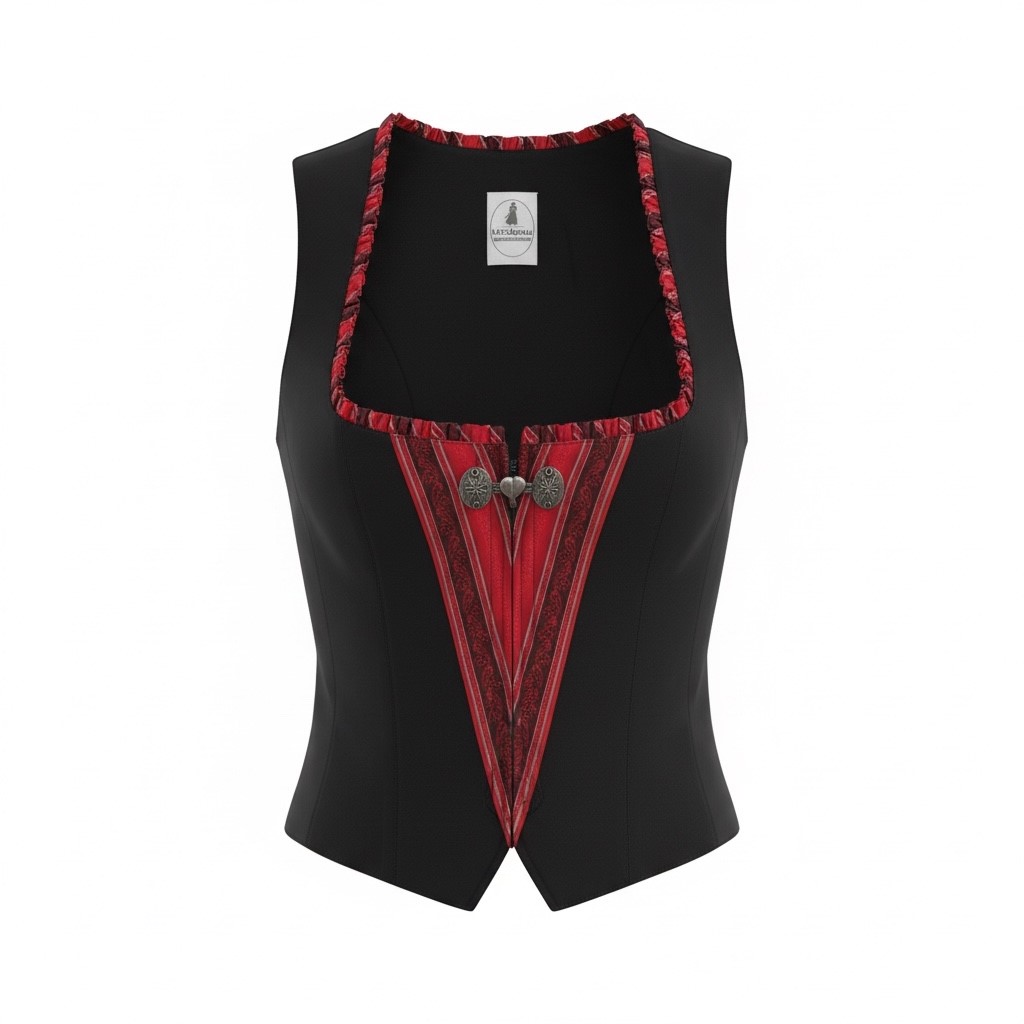 Ein dekorativer Einsatz in Rot mit dezentem Muster verläuft v-förmig im Vorderteil und verleiht dem Mieder eine besondere Tiefe und Raffinesse. Im Rücken wird der rot-graue Einsatz wiederholt. Die harmonische Kombination aus kräftigem Rot und edlem Grau bildet einen attraktiven Kontrast zum schwarzen Grundton und unterstreicht den charakteristischen Trachtenstil. Geschlossen wird das Mieder mit einem praktischen Reißverschluss, der ein unkompliziertes An- und Ausziehen ermöglicht. Eine dekorative Metallschließe mit Edelweiß-Motiv setzt dabei einen traditionellen Akzent und rundet das Design stilvoll ab.