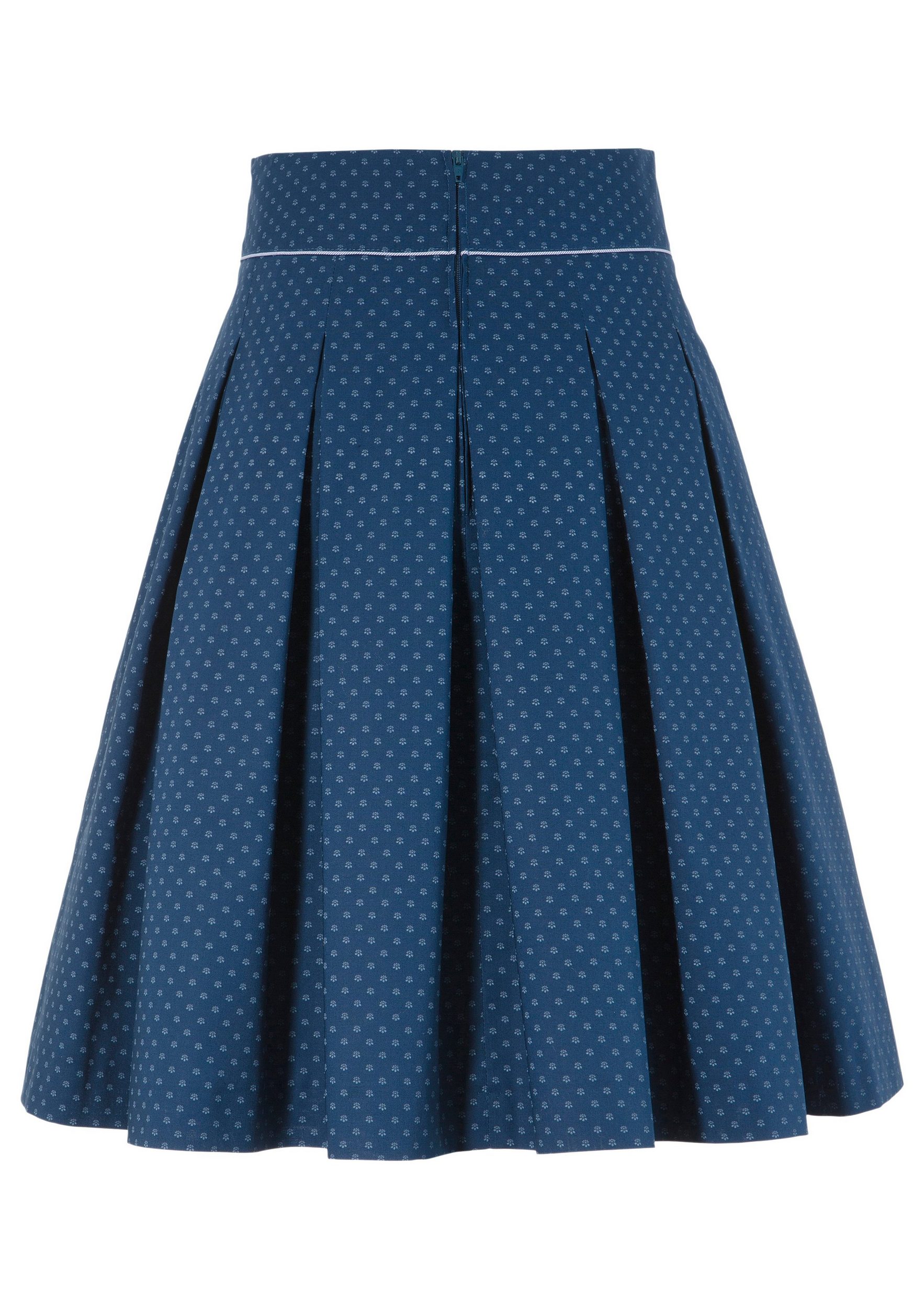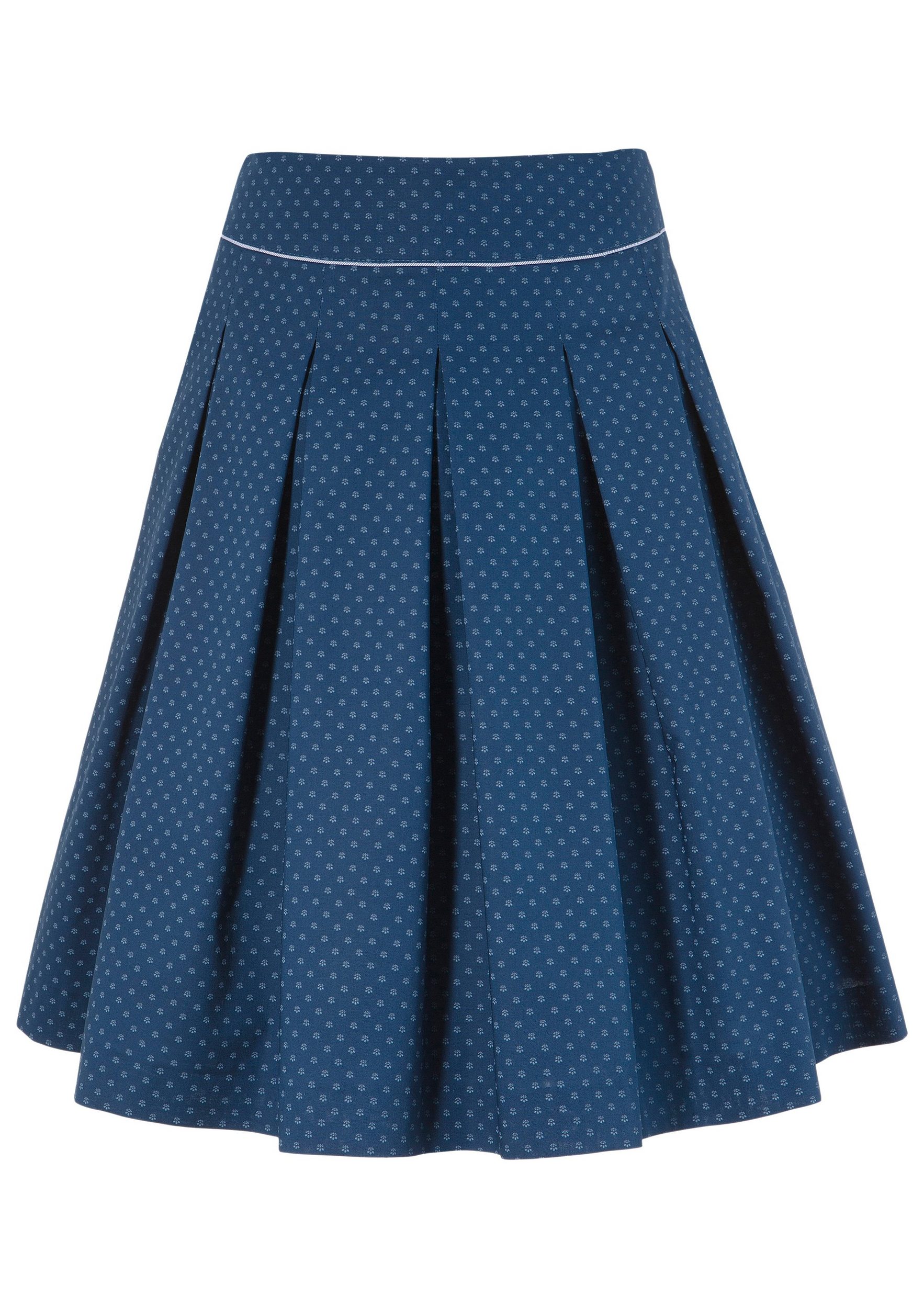in Kürze: Trachtenrock, Länge ca. 58 cm, Farbe: blau, in Falten gelegt, Reißverschluss, breiter Bund