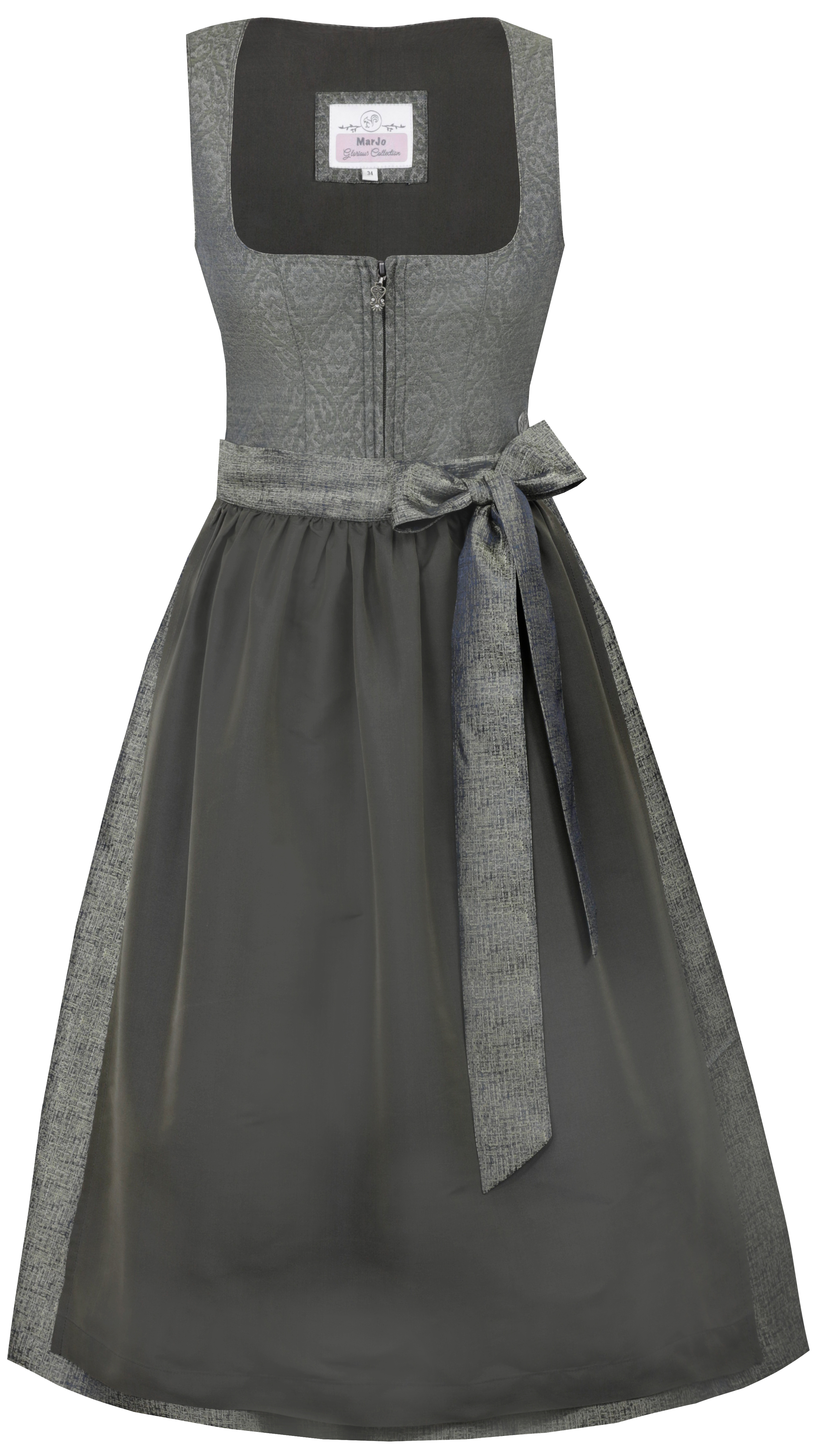 Wunderschönes Dirndl "Biebelried", in farn, aus der aktuellen Kollektion von Marjo. Das Mieder ziert ein edles, ornamentales Muster. Der schlichte, schimmernde Rock, wird durch eine grün-graue Schürze perfekt ergänzt. Highlight sind die Schürzenbänder, welche den Stoff des Rockes aufgreifen. Durch den Reißverschluss vorne mit Zipperanhänger, ist das Kleid bequem anzuziehen. Ein Sommernachtstraum!
