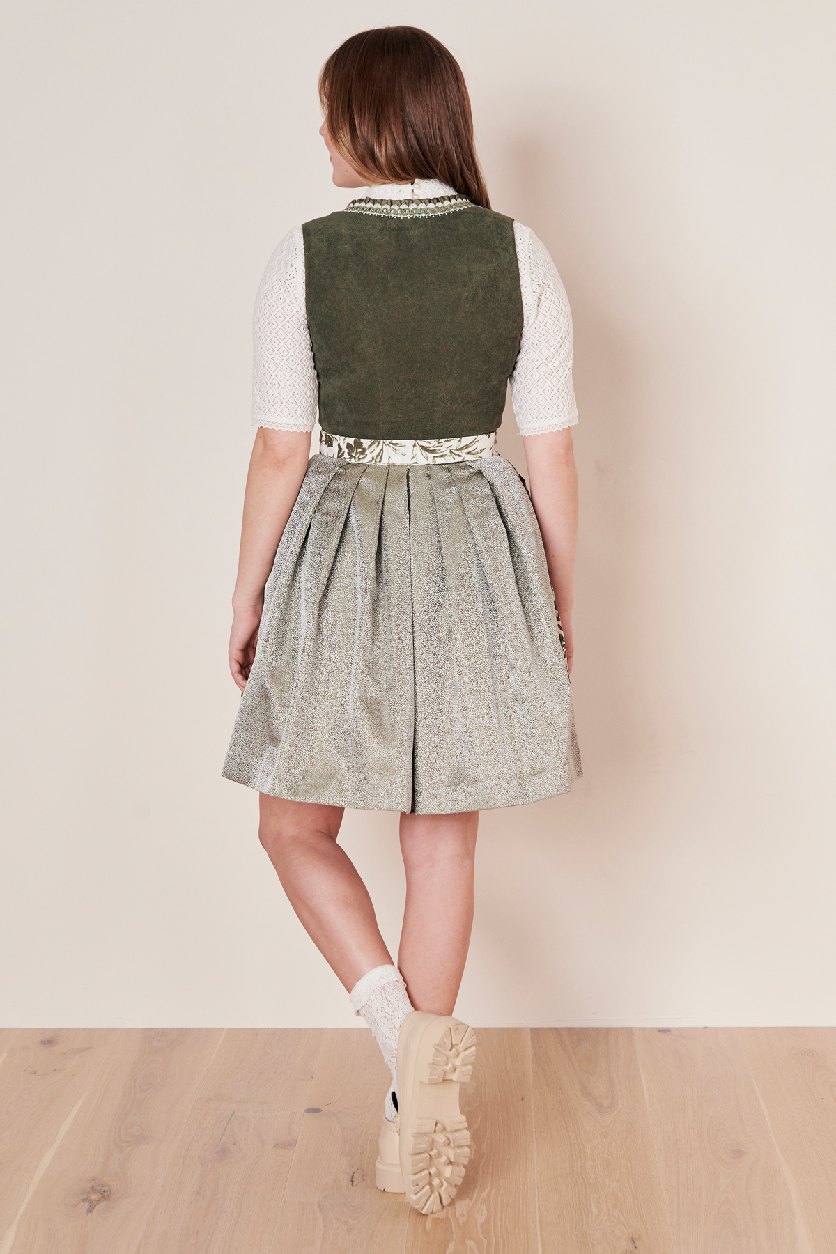 In Kürze: Dirndl mini, Rocklänge: ca. 50 cm, Farbe: oliv / grün, Samt, Wildlederoptik, Eingriffstaschen, Blumenmuster, Reißverschluss, Herzausschnitt