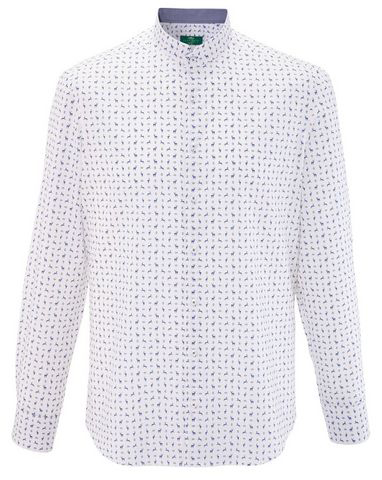 Elegantes Herrenhemd in weiß mit edlem Hirschmotiv in blau von Gloriette. Der Stehkragen und die Manschettenknöpfe sind mit einem Kontraststoff in blau / weiß versehen. Tolle Knöpfe in Perlmuttoptik runden das Gesamtbild ab. Ein langärmeliges Hemd für besondere Anlässe.
