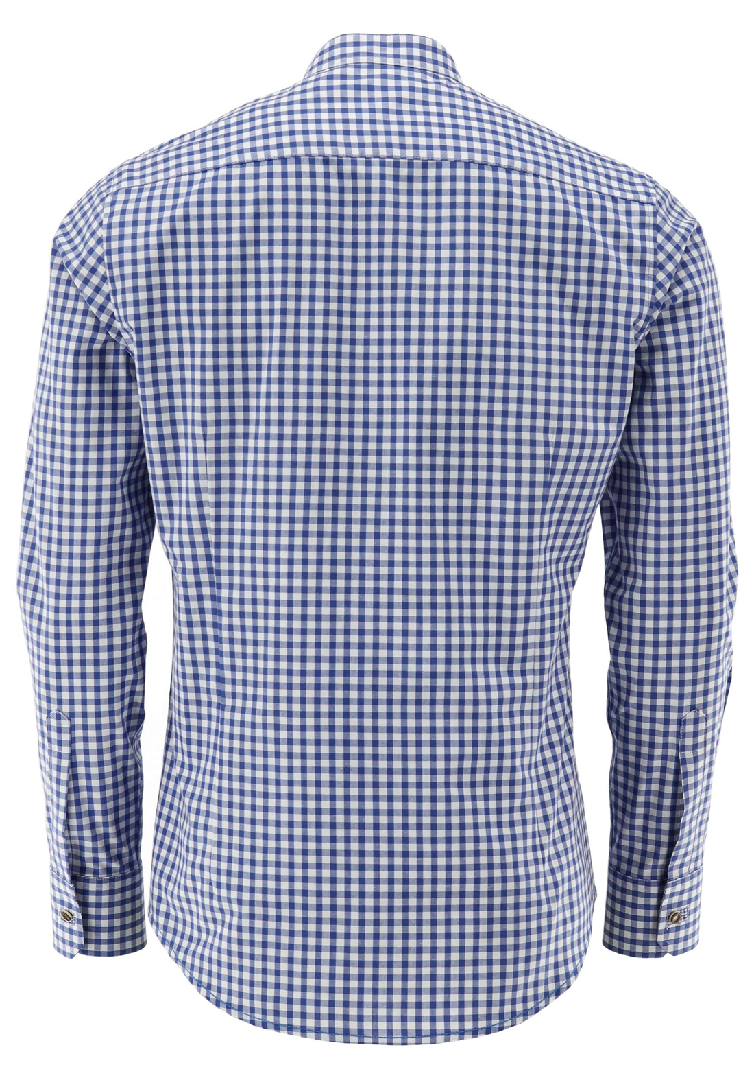 in Kürze: Trachtenhemd, Farbe: mittelblau / blau, kariert, Stehkragen, Riegel mit Knopf, Hirschstickerei, Knöpfe in Hornoptik