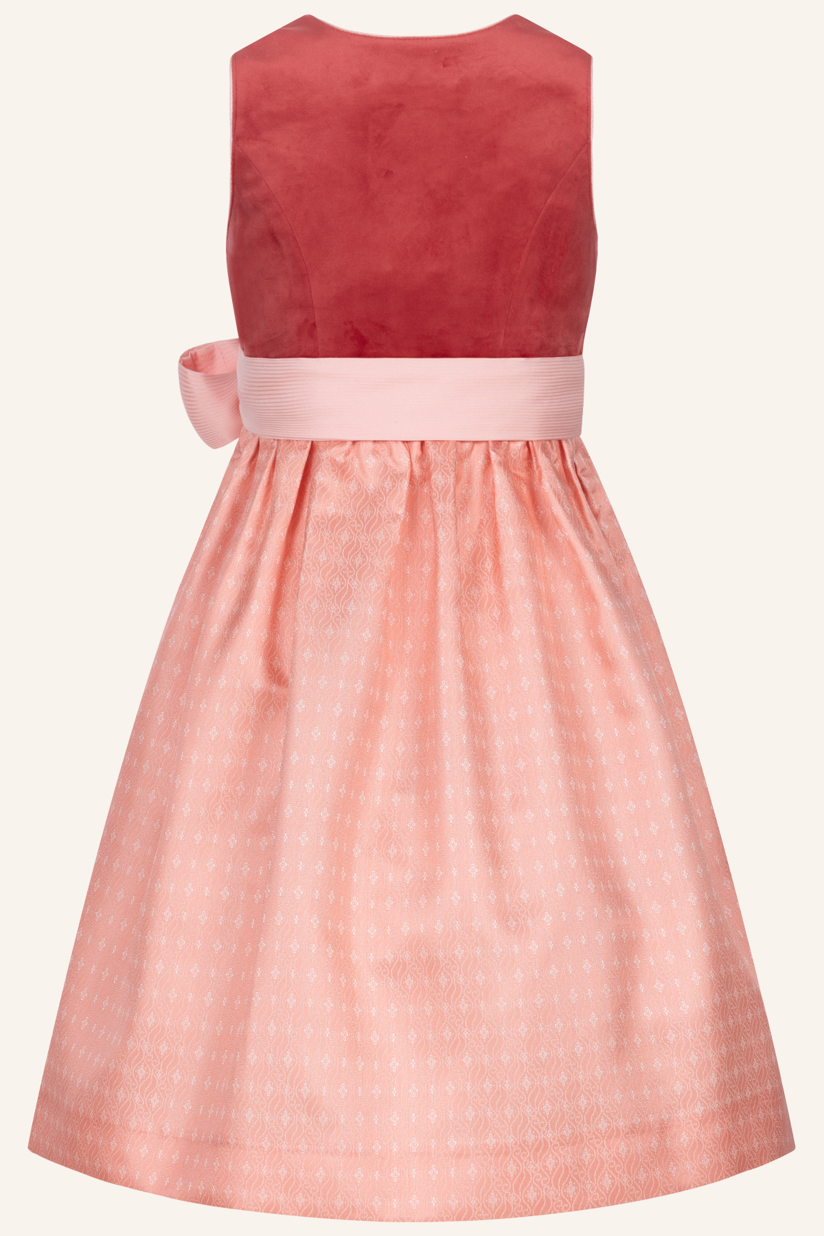 Das niedliche Kinderdirndl "Berina" stammt aus der Krüger KIDS-Kollektion. Das einfarbige, apricot-farbene Mieder in Samtoptik bezaubert mit seiner schlichten, eleganten Wirkung und wird mit einem Reißverschluss zum leichten An- und Ausziehen geschlossen. Der rosa-farbene Rock ist mit einem Ornamentmuster versehen. Die rosa Schürze vervollständigt das hübsche Mädchendirndl.